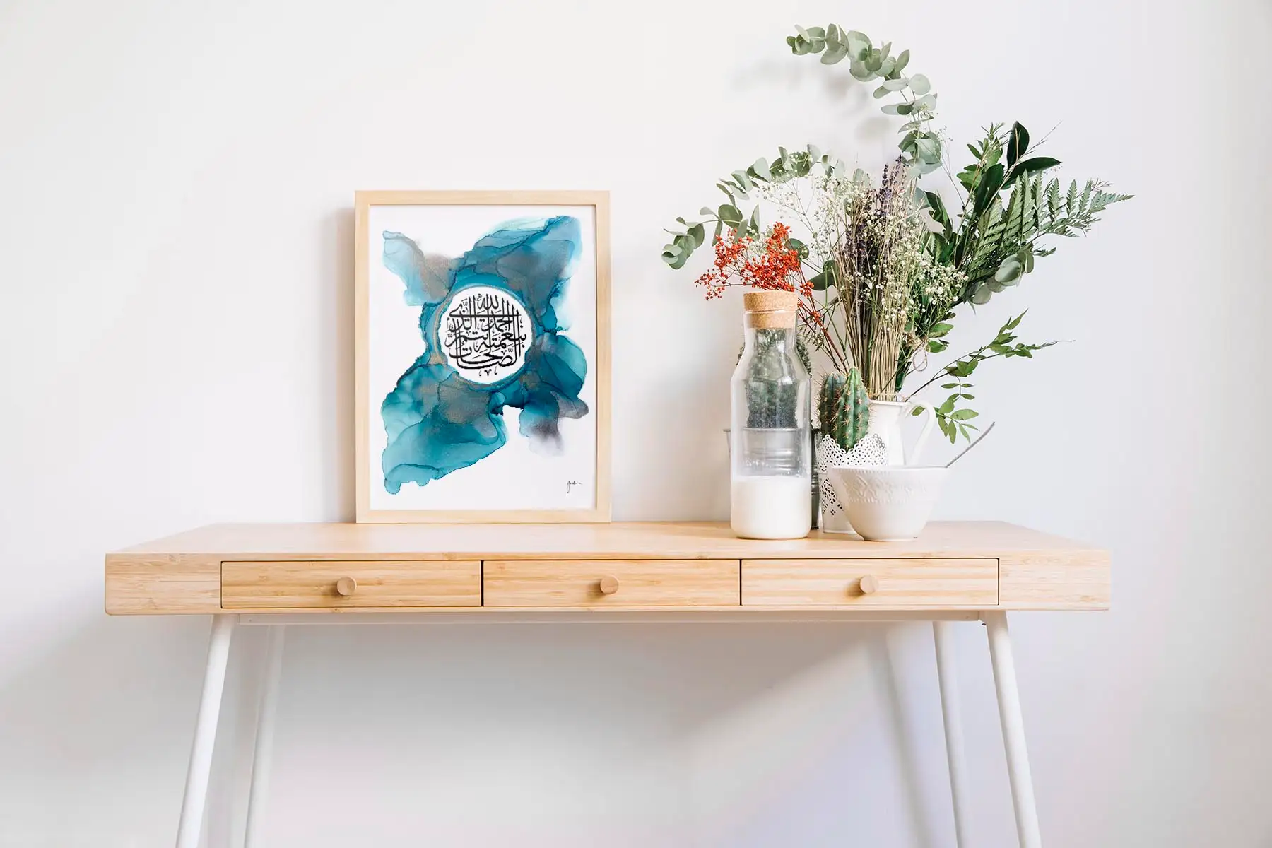 Lámina impresa Alhamdulillah – Caligrafía árabe en tonos azules y dorados