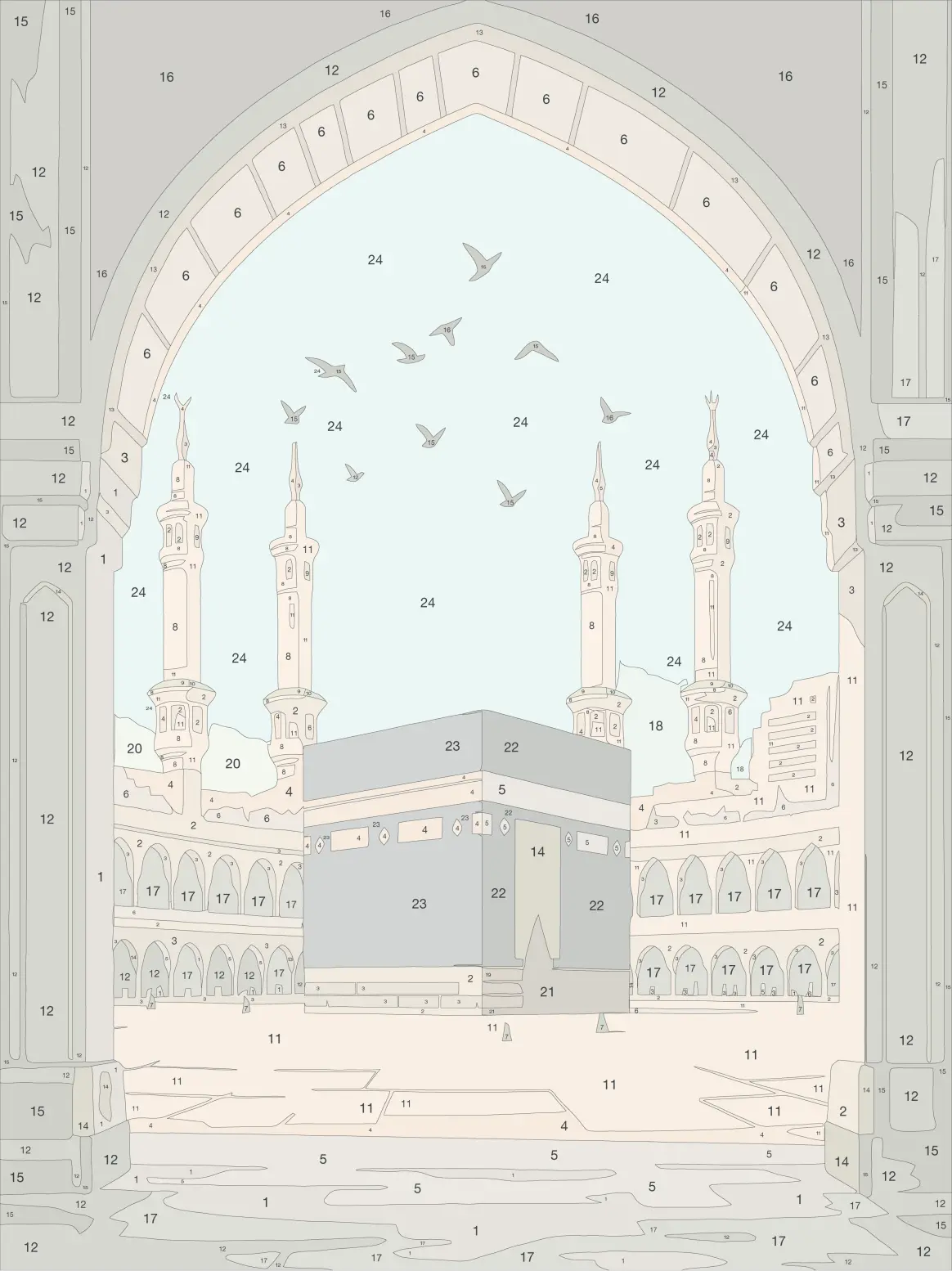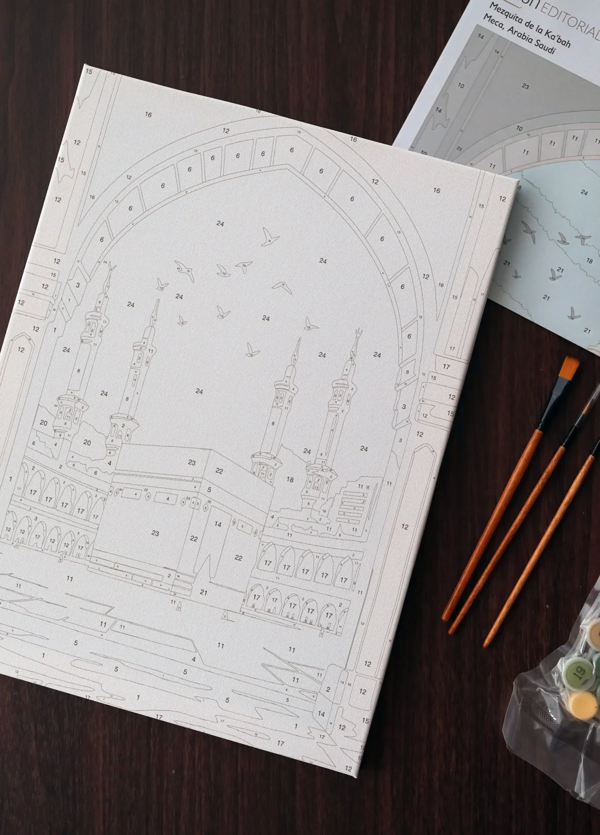 Esta pintura por números de la Mezquita Al-Haram, de la Ka‘bah, en La Meca, es una invitación a detener el ritmo, concentrarse y crear con las propias manos una imagen cargada de significado espiritual.