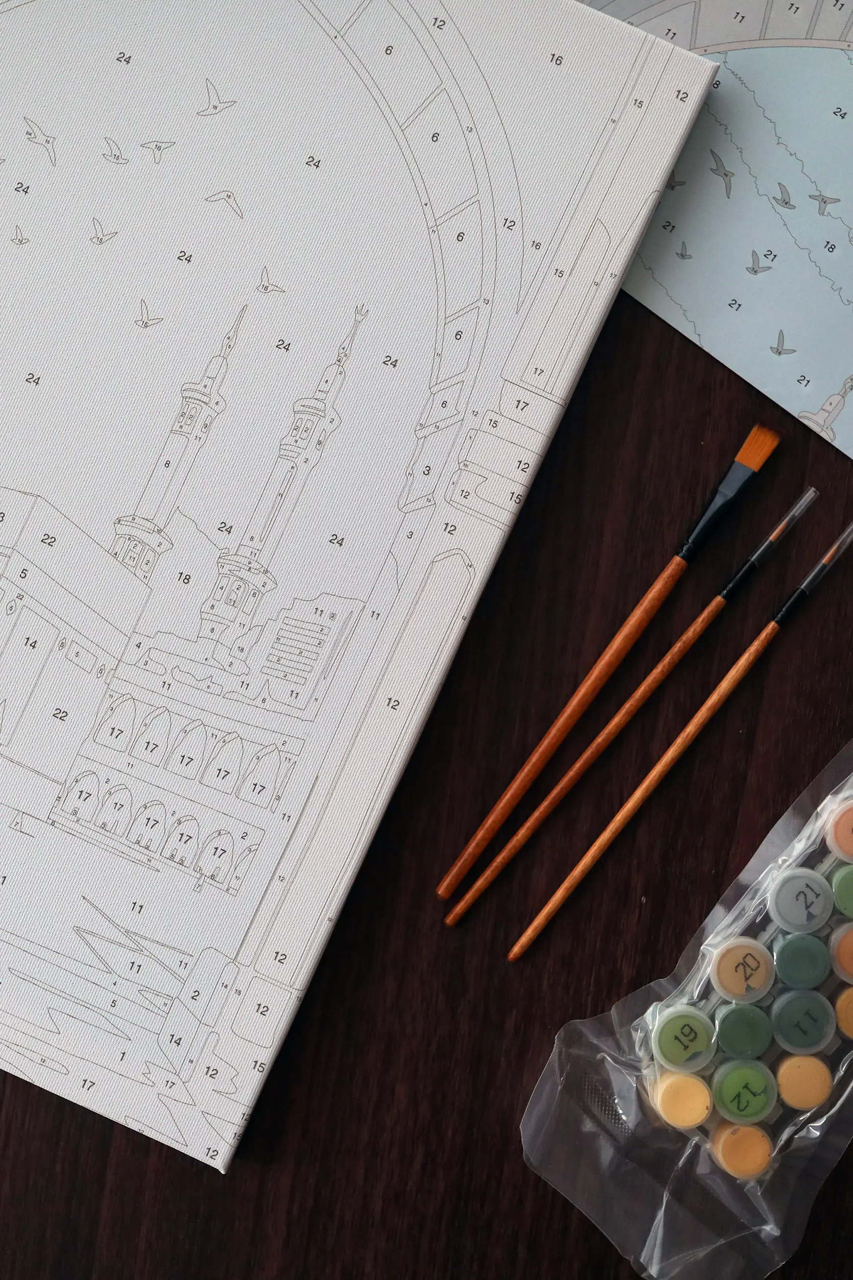 Lienzo impreso de alta calidad con el diseño numerado, donde cada zona indica el color correspondiente. La impresión es nítida y precisa, lo que facilita el pintado y garantiza un resultado armonioso una vez finalizada la obra.